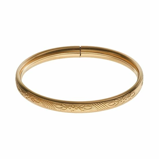 Decorated with an ornate floral motif and textured detailing, this 14k gold-filled bangle bracelet adds a beautiful touch to her outfit.
