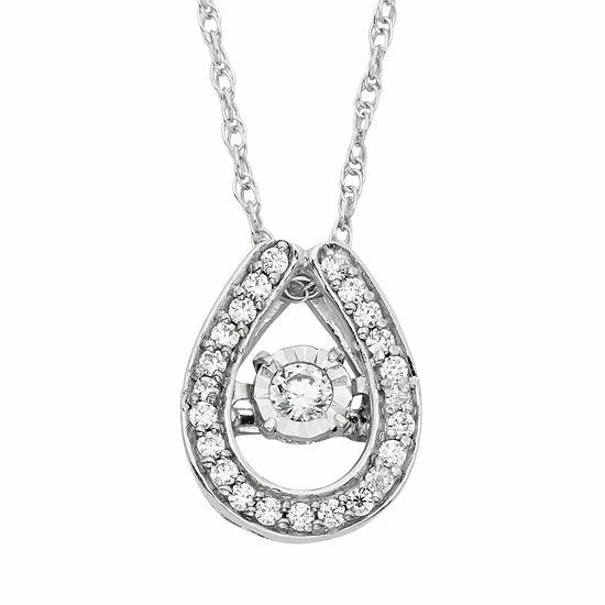 A lovely horseshoe design adorned in diamonds makes this Dancing Love necklace a breathtaking choice. A unique hinged setting allows the center stone to pivot within its frame, creating the effect of dancing light.