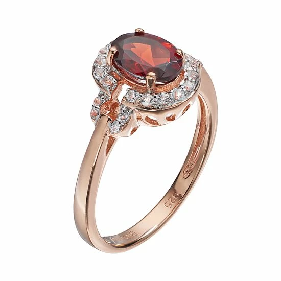 Update any look with this fantastic 14k rose gold over silver ring. White topaz accents beautifully highlight the ring’s spectacular garnet center stone.