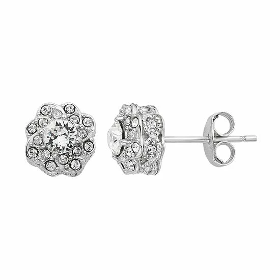 Adorned with crystals and diamond accents in a floral design, these sterling silver stud earrings offer a feminine way to update your look.
