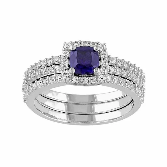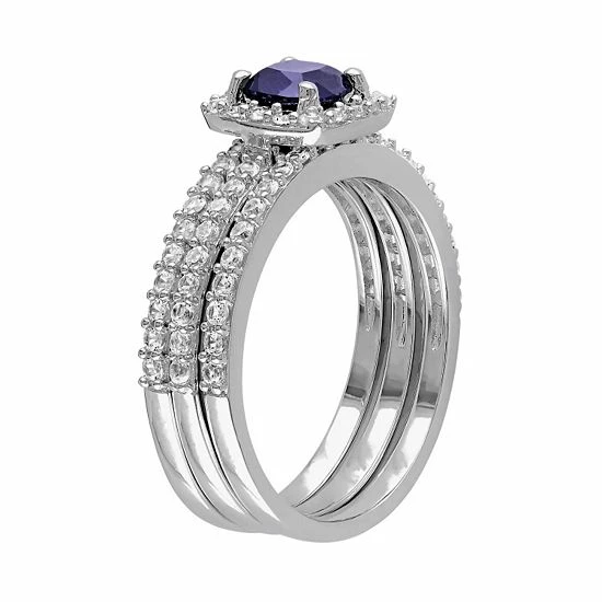 She’ll cherish the unique beauty of this sterling silver engagement ring set. A lab-created blue sapphire center stone makes it a stunning choice, while lab-created white sapphire stones framing the center stone and adorning all three bands add breathtaking scintillation. Comes in a gift box.
